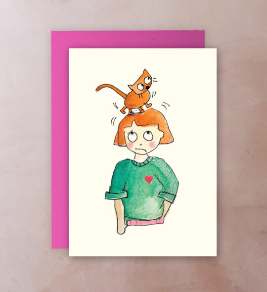 Scratchy Cat, a mischievous feline causing havoc with a girl’s hair, adds a playful touch to any occasion. The whimsical design captures the cheeky nature of Scratchy Cat, making it perfect for cat lovers or anyone who enjoys a little bit of light-hearted chaos. Printed on high-quality cardstock, the charming illustration brings character and personality to your message. Whether it’s for a birthday, thank you note, or just to share a smile, this card is sure to delight anyone who receives it.